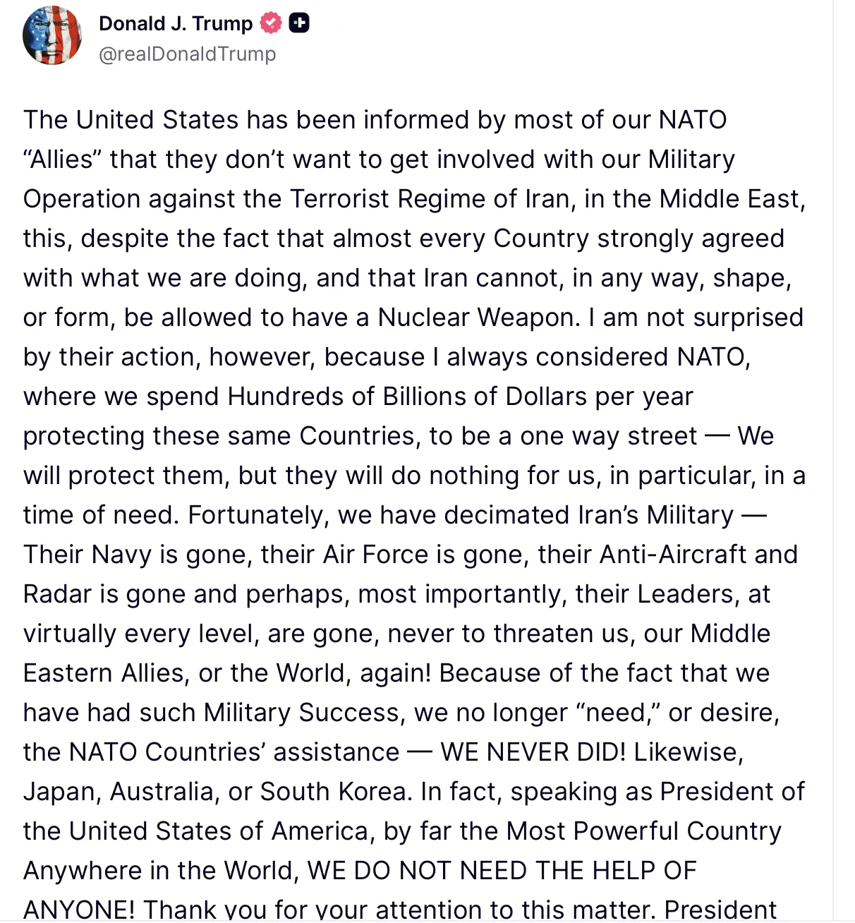 "Elde ettiğimiz askeri başarılar nedeniyle artık NATO ülkelerinin yardımına ihtiyaç duymuyoruz ve bunu istemiyoruz. ZATEN HİÇBİR ZAMAN DUYMADIK! Aynı şekilde Japonya, Avustralya ya da Güney Kore’nin de. Aslında, dünyanın açık ara en güçlü ülkesi olan Amerika Birleşik Devletleri’nin başkanı olarak konuşuyorum: HİÇ KİMSENİN YARDIMINA İHTİYACIMIZ YOK. "