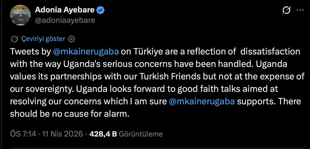 “Kainerugaba’nın Türkiye hakkındaki tweet'leri, Uganda'nın ciddi endişelerinin ele alınış biçimine duyulan hoşnutsuzluğun bir yansımasıdır. Uganda, Türk Dostlarımızla olan ortaklıklarını önemsiyor ancak bu, egemenliğimizi feda ederek değil. Uganda, endişelerimizi çözmeye yönelik iyi niyetli görüşmelerin yapılmasını dört gözle bekliyor ve eminim ki Kainerugaba da bunu destekliyor. Alarm verilecek bir neden yok.”