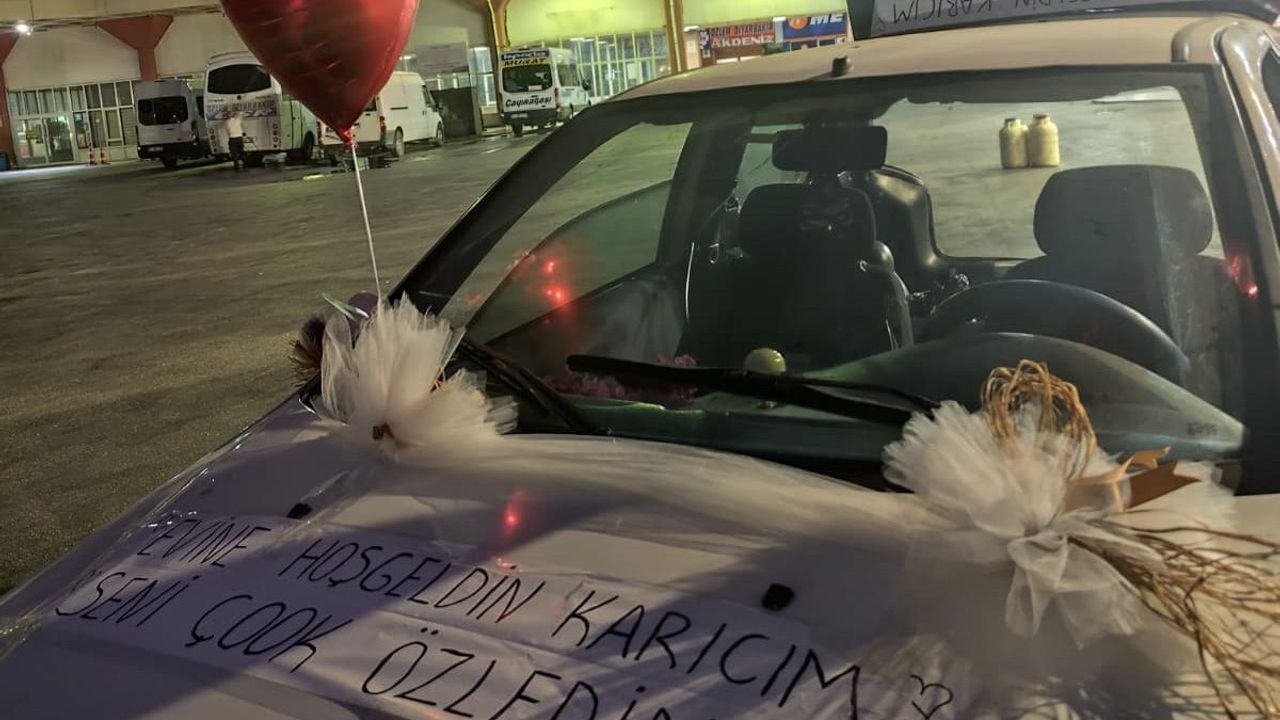 Adana'da yaşayan Sadık Şaşmaz, memleketinden dönen eşini otogardan alacağı sırada otomobilini balonlar ile süsleyip, 'Seni çok özledim karıcığım, evine hoş geldin' yazılı pankart ile karşıladı. Şaşmaz, "Sadece ona olan sevgim için böyle yaptım. İnşallah bir gün hanımcılık kazanır" dedi.