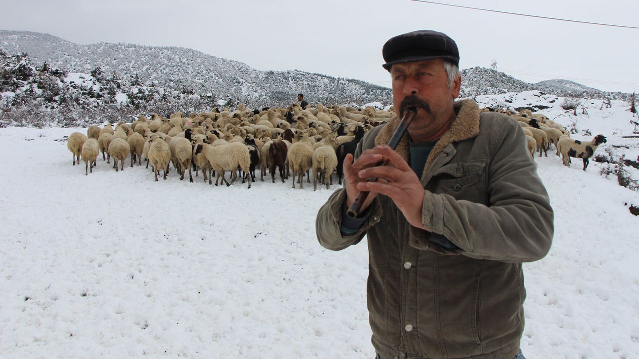 Emektar çoban koyunlara yaz kış kaval çalıyor