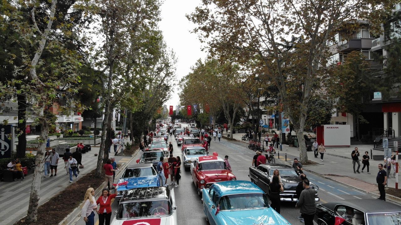 Kadıköy'de, 100 klasik otomobil sürücüsü Cumhuriyet'in kuruluşunun 100. yılı nedeniyle konvoy oluşturdu. Etkinliğe çevredekiler de ellerindeki bayrakları sallayarak katıldı. Kutlama dron ile görüntülendi.