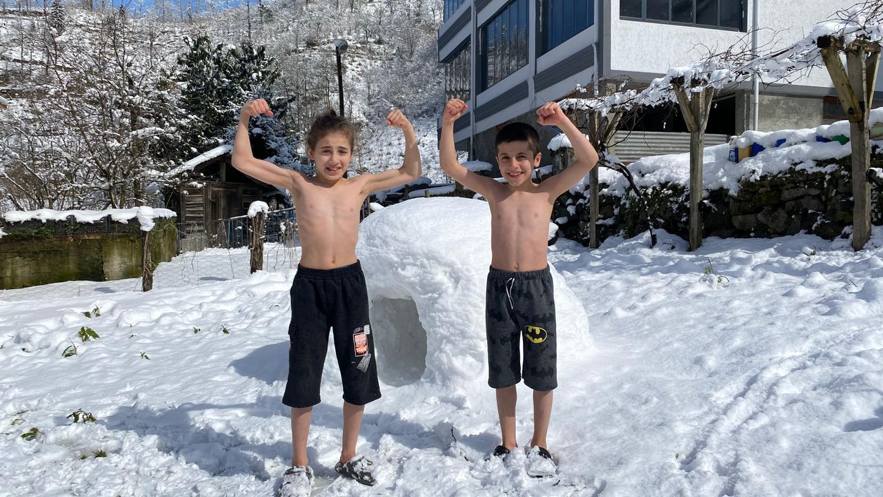 Artvin'de iki kardeş, kışın soğuk havasına aldırış etmeden kar üzerinde güreş tutarak eğlenceli anlar yaşadı. İstanbul'u terk ederek köye yerleşen aile, çocuklarının doğal ortamda daha zinde olduklarını belirtiyor.