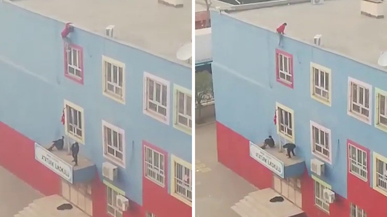 Kızıltepe ilçesinde bulunan Atatürk İlkokulunda çocuklardan biri çatıya çıkıp metrelerce yükseklikten aşağı sarktı. Gruptaki diğer çocuklar ise okulun avlusunda bekledi.