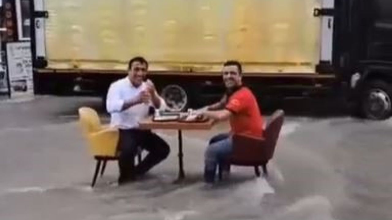 Yenimahalle ilçesine bağlı Şentepe semtinde oluşan küçük çaplı seli umursamayan iki vatandaş, masa ve sandalyelerini caddenin ortasına koyarak...