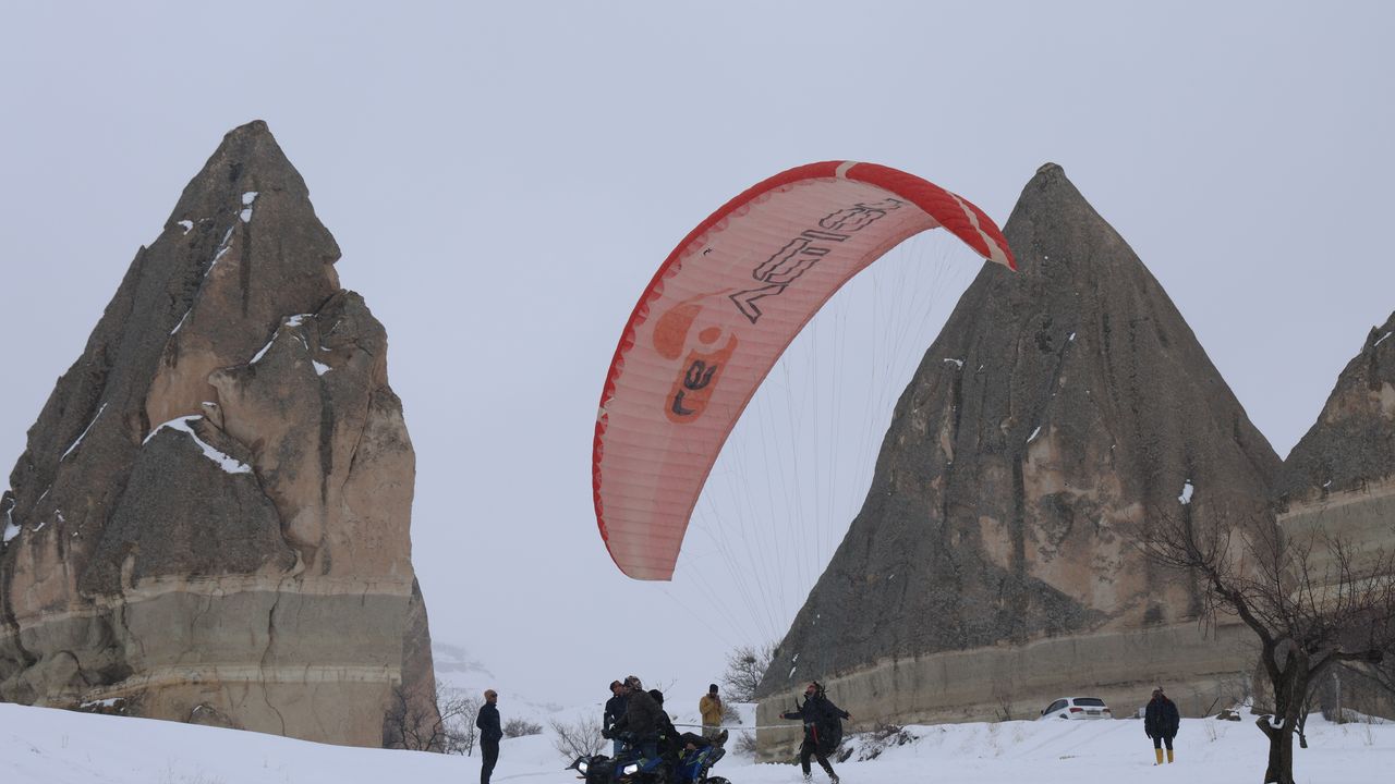 Kapadokya'da bir araya gelen ekstrem spor tutkunları, iş makinesi ile 360 derece dönerek kaymanın keyfini yaşadı. Nevşehir'de bir araya gelen ekstrem spor tutkunları, peribacaları arasında sıra dışı deneyimlere imza attı.