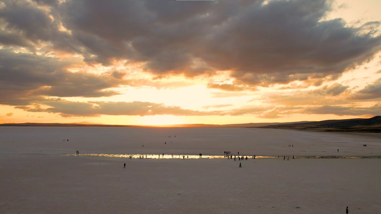 Türkiye'nin etkileyici doğal zenginliklerinden biri olan Tuz Gölü, gün batımıyla mest ediyor. Beyaz tuz örtüsüyle bütünleşen kızıl ve turuncu tonlardaki gökyüzü, yerli ve yabancı ziyaretçilere görsel bir şölen sunuyor. Akşam saatlerinde göl kenarına gelenler, doğayla iç içe huzur dolu anlar yaşarken, manzaraya karşı hayranlıklarını gizleyemiyor.