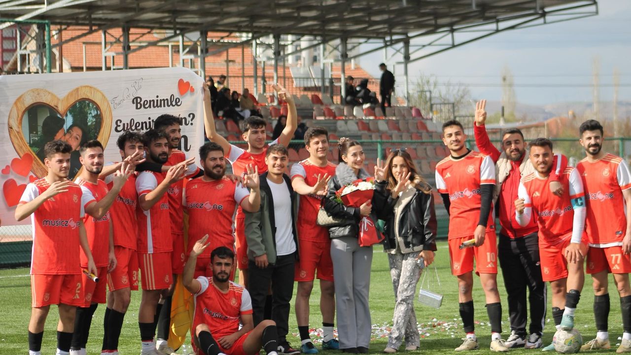 Kayseri 2. Amatör Küme ekibi Yavru Aslanspor’un takım kaptanı Muhammed Tarık Tiryaki, Akkışla Gençlikspor karşılaşması sonrası takım arkadaşları ve taraftarların tezahüratları eşliğinde kız arkadaşı Sıla Arıkan’a evlilik teklifi yaptı.