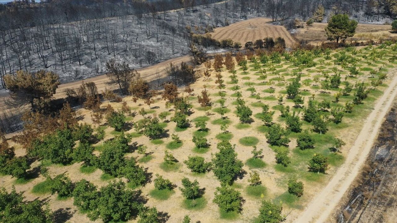 Eceabat'a bağlı Kumköy'de ailesiyle 30 dönüm alanda ceviz üretimi yapan Ahmet Diksin'in arazisi de yangından çok az etkilendi.