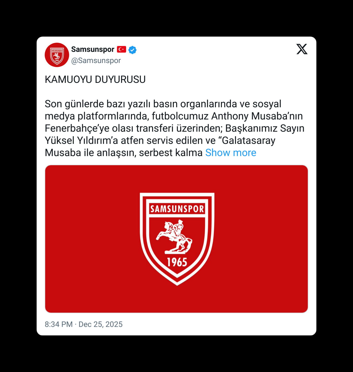 "Son günlerde bazı yazılı basın organlarında ve sosyal medya platformlarında, futbolcumuz Anthony Musaba’nın Fenerbahçe’ye olası transferi üzerinden; Başkanımız Sayın Yüksel Yıldırım’a atfen servis edilen ve “Galatasaray Musaba ile anlaşsın, serbest kalma bedelinin altında bir rakama oyuncuyu veririz” şeklinde yansıtılan ifadeler gerçeği yansıtmamaktadır.